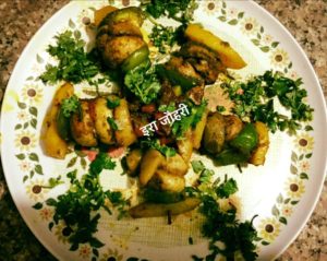 शिमलामिर्च चौकोर और आलू पतले टुकड़े मे काट ले टमाटर भीछोटे टुकड़ों मे काट ले