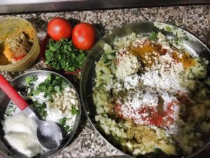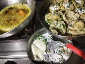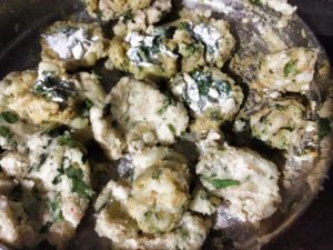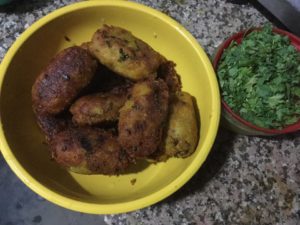 आलू उबाल कर कद्दूकस कर के अच्छी तरह मसल ले आधी मात्रा मे थोड़ा आरारोट व चावल का आटा तथा बची आधी मे बेसन डाले हराधनिया नमक मिर्च गरम मसाला बेसन सभी मे डाले बेसन की तरफ़ हीग व हल्दी भी डाले एक अलग बर्तन मे गाढी मलाई निकाल कर उसमे काजू के टुकड़े कटा हराधनिया ,अदरक , किशमिश मिलाये