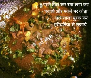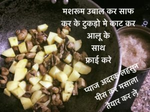 मशरूम उबाल कर साफ कर के टुकड़ो मे काट कर आलू के साथ फ्राई करे और प्याज लहसुन अदरक पीस कर मसाला तैयार कर ले दोनो को भूनने के बाद निकाल ले बचे गर्म तेल मे जीरे से तड़का देकर पिसा मसाला डाले हल्दी ,धनिया ,मिर्च ,नमक ,व गरममसाला भी मिलाये मसाला भून कर फ्राई की हुई सब्जी मिला कर भूने पानी डाल कर रसा लगा कर पकाये और पकने पर थोड़ा गरमसाला बुरक कर हरीधनिया से सज़ाये