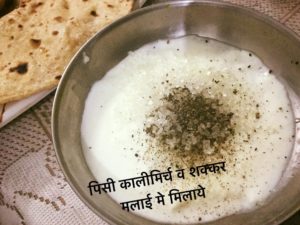 भोजन के पश्चात मुँह मीठा करने व गले मे यदि खराश हो तो पिसी कालीमिर्च मलाई मे डाल कर स्वादानुसार मिठास मिला कर खाये
