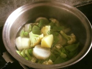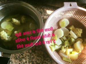 सब्ज़ियों को साफ करके उबलते पानी मे डाल कर गैस बन्द कर दे ठंडा होने पर सूखे अचार के लिये सब्ज़ियों को पानी से निकाल कर हवा या धूप मे रख कर थोड़ी देर पानी सुखाये और फिर पिसी हीँग ,हल्दी ,मिर्च ,मोटी सौंफ नमक सोंठ व राई मिला कर सरसो का तेल डाल कर चला फिरा कर धूप दिखाये