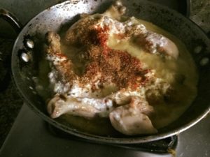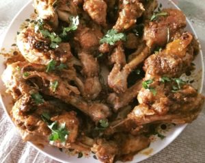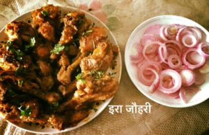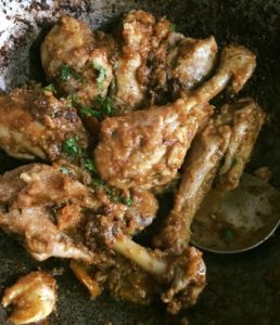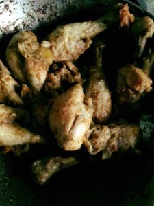 नमक मिर्च हल्दी धनिया गरम मसाला दही टमाटर पिसा अदरक लहसन प्याज़ सभी सामग्री मुर्ग़ पर डाल कर रख दे। तेल गर्म करे एक एक करके सभी टुकड़े डाल कर ढक कर पकाये थोड़ी देर मे टुकड़े गल जायेंगे और पानी छूट जायेगा