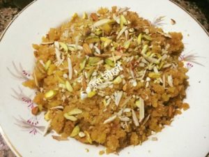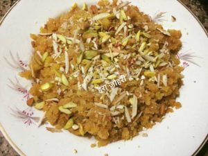 भूनते समय थोड़ी गाढी मलाई भी मिला दे अच्छी तरह भूने और अब शक्कर भी मिलाये दूध या पानी के छींटे मारते हुये सुनहरा होने तक भूने छींटे मारने से शक्कर भी घुल जायेगी और दाल भी पक कर फूल जायेगी दाल को सुनहरा बोने तक भूने और थोड़े से गर्म दूध मे जरा सी केसर डाले दूध मे जा कर केसर घुल जायेगी यह केसरिया दूध हल्वे मे मिला दे साथ ही यदि आप चाहे तो खोया भी मिला सकते है थोड़ी देर तक भूने और कुछ मेवे बाद मे सजाने के लिये बचा ले