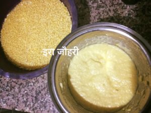 लगभग पाँच छ: घंटे भीगी फूली धुली मूँग की दाल को हल्का पानी डाल कर महीन पीस ले