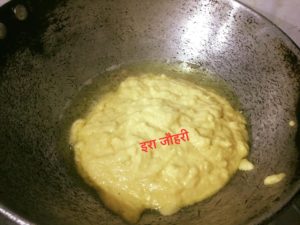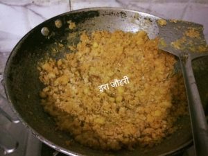 दूध या पानी के छींटे मारते हुये सुनहरा होने तक भूने छींटे मारने से शक्कर भी घुल जायेगी और दाल भी पक कर फूल जायेगी