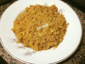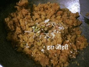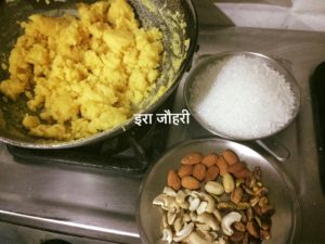 जब तक अच्छी तरह भुने बराबर की शक्कर और मेवे निकाल कर तैयारी कर ले