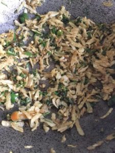 पकने पर कद्दूकस किया अदरक कटी हरी धनिया मिर्च मिलाये ठंडा होने पर नमक मिलाये