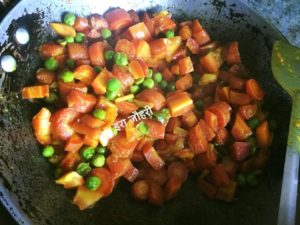 गर्म तेल मे कटा प्याज डाल कर भून कर कटी गाजर न मटर के दाने डाल कर हरी मिर्च व अदरक पिसी मेथी दाना ,हल्दी व नमक के साथ मिला कर चला फिरा कर ढक कर धीमी आँच पर पकाये और पकने पर कटा टमाटर मिला कर खुला खुला भून कर खूब सारी कटी हरीधनिया मिलाये चाहें तो कटी हरी मेथी भी मिलाये
