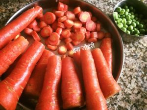 गाजर साफ करके टुकड़ो मे काट ले बीच की जड़ का भाग यदि कड़ा हो तो निकाल दे ताज़ी मीठी गाजरी मटर की सब्जी भी बढिया बनती है