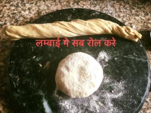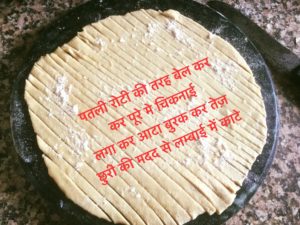 पतली रोटी की तरह बेल कर कर पूरे मे चिकनाई लगा कर आटा बुरक कर तेज़ छुरी की मदद से लम्बाई में काटे