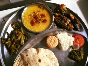 लहसन मिर्च और प्याज मिर्च से छुकी अरहर कीदाल ,मसालेदार भरवा बैगन और लहसनमिर्च की भट् या ग्वार की फली गरमागरम फूली हुई रोटी , चावल चटनी और सलाद और साथ ही मुँह मे मिठास घोलने के लिये बाजार का बना खोये का पेड़ा भी है