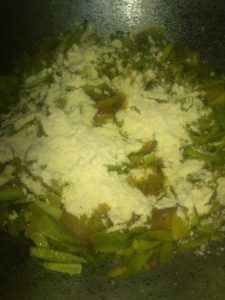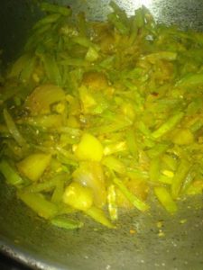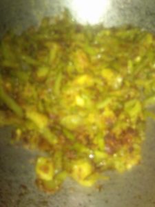 गलने पर बेसन डाल कर चलाये व हल्का पानी के छीटे दे कर भूने