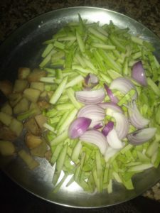 लौकी के मोटे छिल्के उतार कर पतला पतला काट ले आलू और प्याज भी काटे