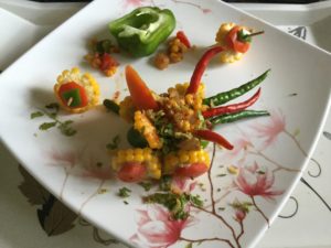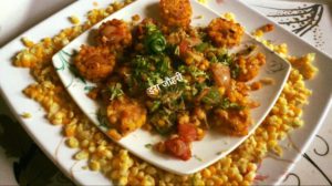 तैयार भुट्टे के दानो के ऊपर कटा हराधनिया डाल कर कद्दूकस की हुई अदरक से सजाये