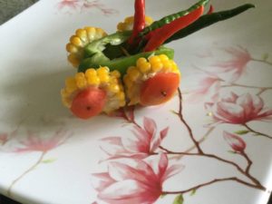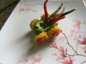 शिमलामिर्च को लम्बाई मे दो टुकड़ो मे काट कर बीच से खोखला करके टूथपिक की सहायता से भुट्टे के चक्को मे टमाटर व शिमलामिर्च के छोटे चौकोर या गोल टुकड़ो को फँसा कर शिमलामिर्च के बड़े टुकड़े मे लगा कर ट्राली बनाये और फिर अपनी इच्छानुसार सजाये
