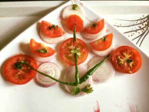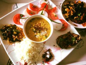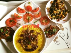 भोजन मे है धुली उड़द की दाल ,चावल ,गोभी के पत्तो का साग ,शाहा भरवाँ तवा बैगन पौष्टिक सलाद और देशी घी मे भुनी लालमिर्च जिसको तोड़ कर उसपर नमक डाला गया है जो भोजन का स्वाद बढा देता है