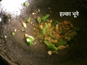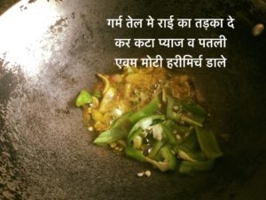 गर्म तेल मे राई का तड़का दे कर कटा प्याज व पतली एवम मोटी हरीमिर्च डाले
