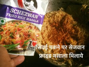 और हाँ सिंवई पकाते समय स्वादानुसार नमक मिलाना ना भूले जब सिंवई फूल कर पक कर तैयार हो जाये सेजवान फ्राइड राइस मसाला मिला कर तेज़ आँच पर अच्छी तरह चला कर के फ्राई किया हुआ प्याज व मिर्च मिला कर स्वादिष्ट चटपटी सेजवान फ्राइड सिवई बनाये कटी हरीधनिया से सज़ा कर पेश करें