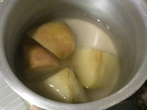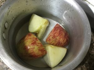 सेब काटकर अल्मुनियम के बर्तन मे रखे और इतना पानी डाले कि फल डूब जाये ।अभ धीमी आँच पर पका कर गला ले और फिर स्वादानुसार भुना पिसा जीरा व कालानमक मिला कर छिल्का निकाल कर स्वाद ले ।