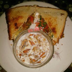 हरी सब्ज़ियाँ और आलू की टिक्की वाला चीज़ सैन्डविच तथा ओट्स की मेवायुक्त खीर !!!!!