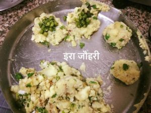 आलू उबाल कर मसल कर नमक मिर्च गरममसाला और कुछ कटी हुई मेथी की पत्तिया या कसूरी मेथी और महीन कटी या कद्दूकस से कसी अदरक मिलाये अच्छी तरह सब मिला कर गोल गोल लोई बना कर बीच मे छुकी हुई मटर भर कर लोई बन्द करके हाथो से दबा कर चपटा करके गर्म तवे पर चिकनाई लगा कर टिक्की बनाये नया आलू जो बाजार मे आ रहा है उसकी टिक्की घी मे नही खेरती पर यदि आलू चिकनाई मे जा कर खेरने या फैलने लगे तो जरा सा आरारोट आलू की सामग्री मे मे मिलाये या गेहूँ का आटा टिक्की पर परथन की तरह लगा कर टिक्की सेके