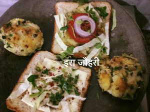 इसको बनाने के लिये चाहिये आलू की टिक्की , अमूल चीज , कुछ महीन कटा हुआ पत्तागोभी , मेथी का साग , हरीमिर्च , गोलाई मे कटा टमाटर और देशी घी ब्रेड को सेकने के लिये हमवे यह तवे पर सेक कर बनाये है