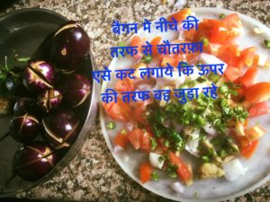 बैगन मे नीचे की तरफ से चौतरफ़ा एसे कट लगाये कि ऊपर की तरफ वह जुड़ा रहे