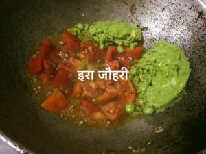 गरम तेल मे हीग जीरे का तड़का लगा कर कटे टमाटर डाल कर चला फिरा कर पिसी सामग्री डाल कर हल्दी धनिया मिर्च नमक भी डाले पानी के छिट्टे मार के भूने यदि चाहे तो कुछ साबित मटर भी डाले जब अच्छी तरह भुन जाये पानी डाल कर रसा लगा कर रझाये