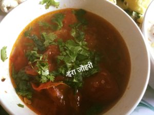 पका टमाटर काट कर गर्म देशी घी मे जीरे मिर्च से छौक कर अदरक कुचल अथवा काट कर डाल कर जरा सा पानी भी डाल कर स्वादानुसार सेधा नमक डाल कर पकाये गलाये और पकने पर स्वादानुसार या हल्की मिठास मिला कर खट्मिटठे टमाटर बनाये हरीधनिया से सजाये