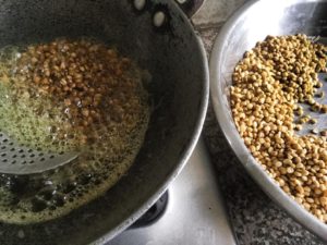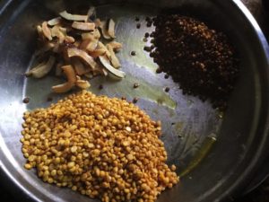 मसूर व चने कीलती हुई दाल व तली हुई गरी