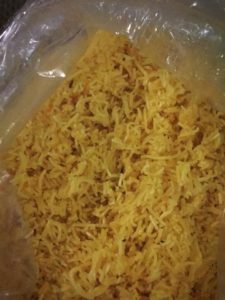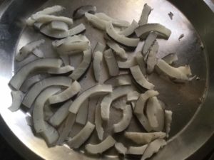 गरी के चाकू से हल्की मोटी चिप्स काट ले और तल कर कॉर्नफ्लैक्स वाली दालमोठ मे मिलाये